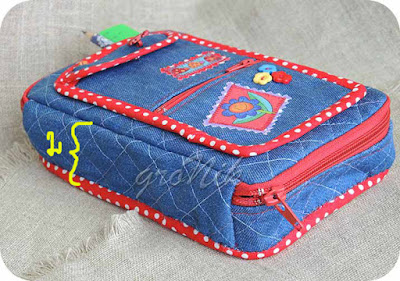 Таким образом, боковая часть пришивается к крышке - непосредственно самой молнией , а к дну- пришита полосой джинсовой ткани. Это